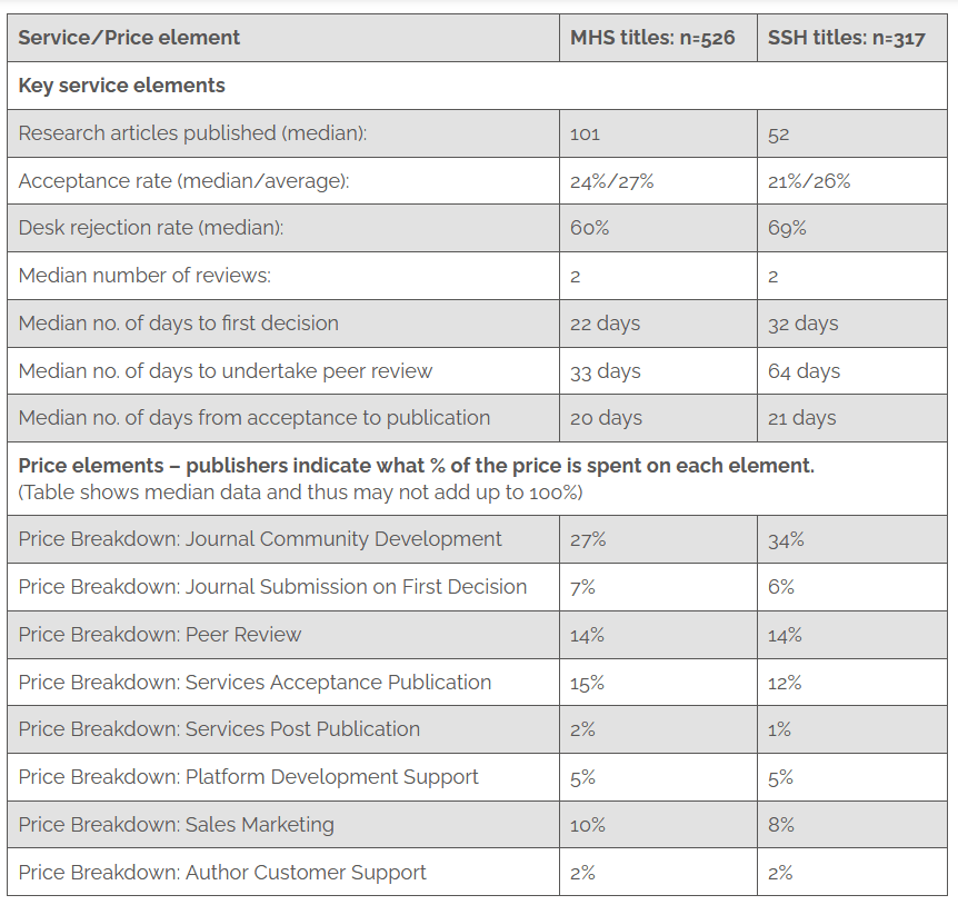 L’étude nous donne des informations sur les différents services fournis par les revues. On y apprend par exemple que le processus de peer-reviewing est deux fois plus long en SSH qu’en MHS (64 jours contre 33).